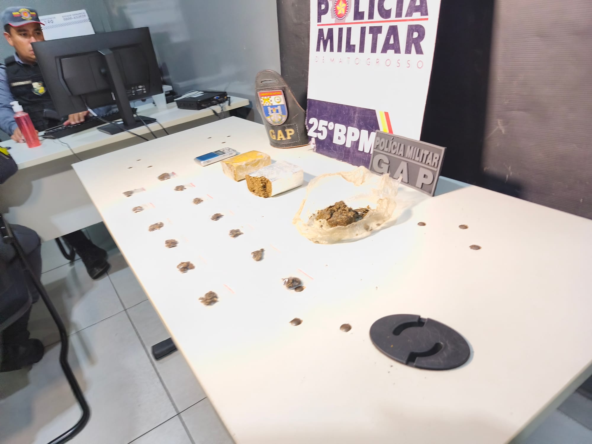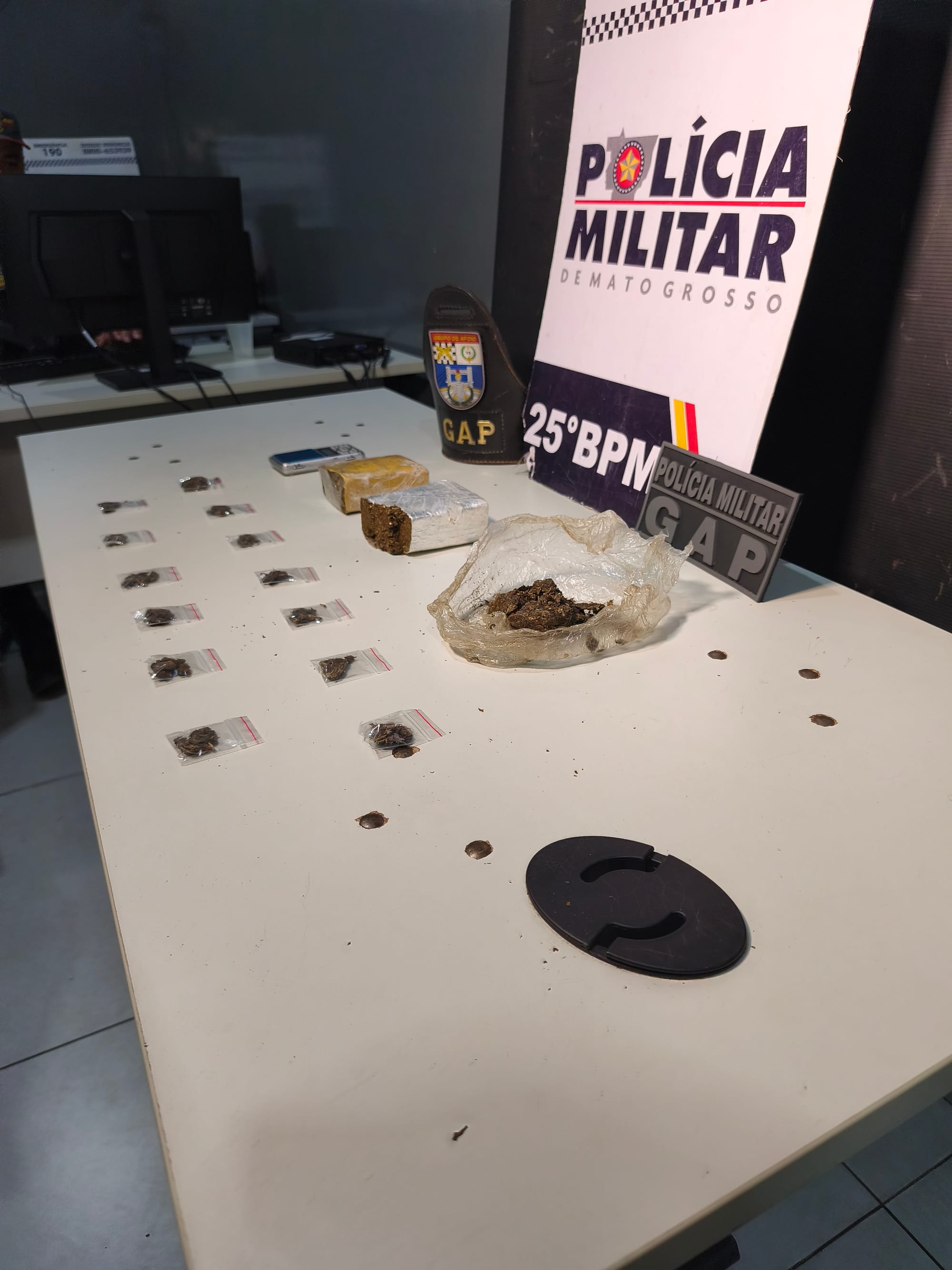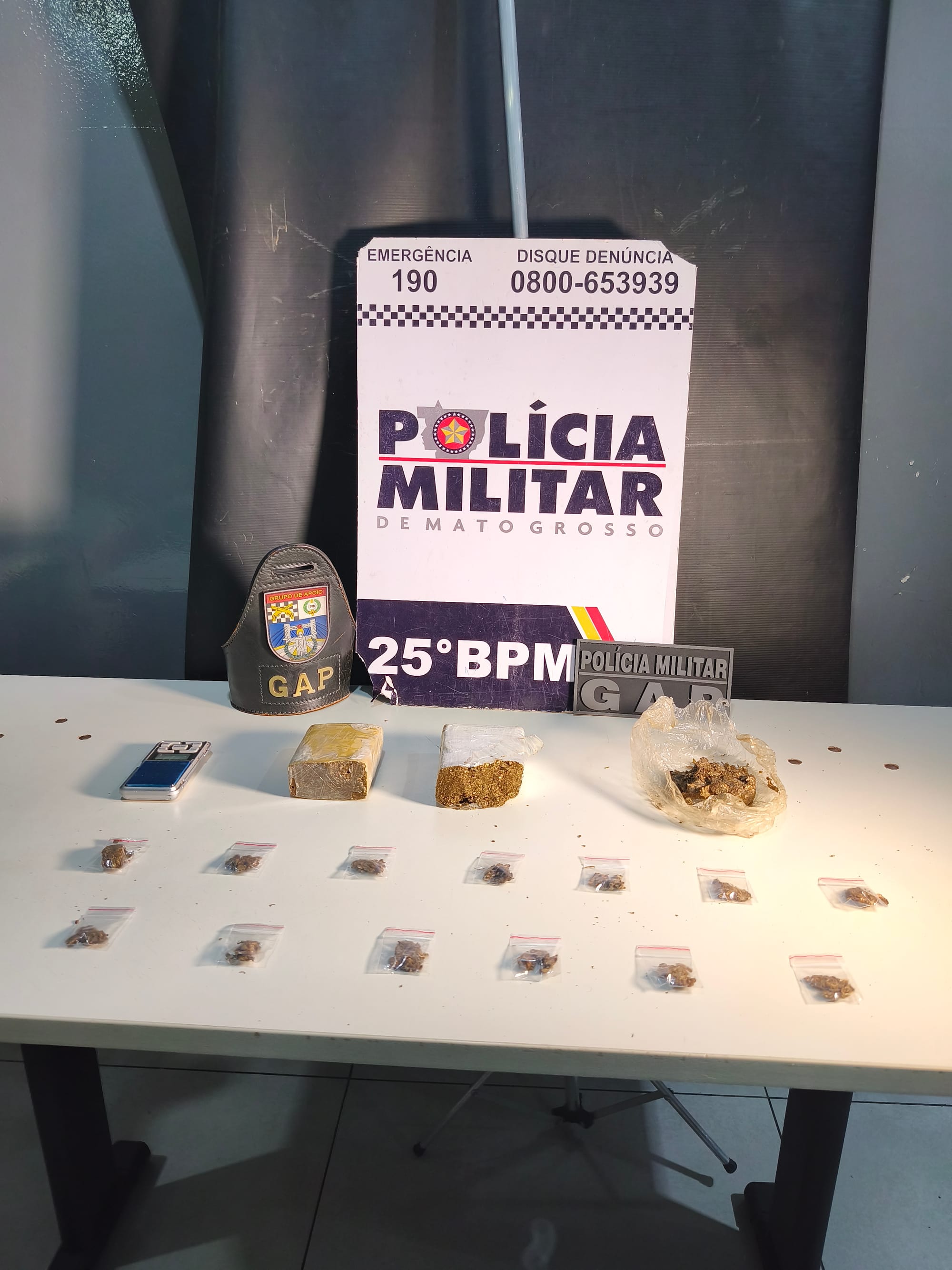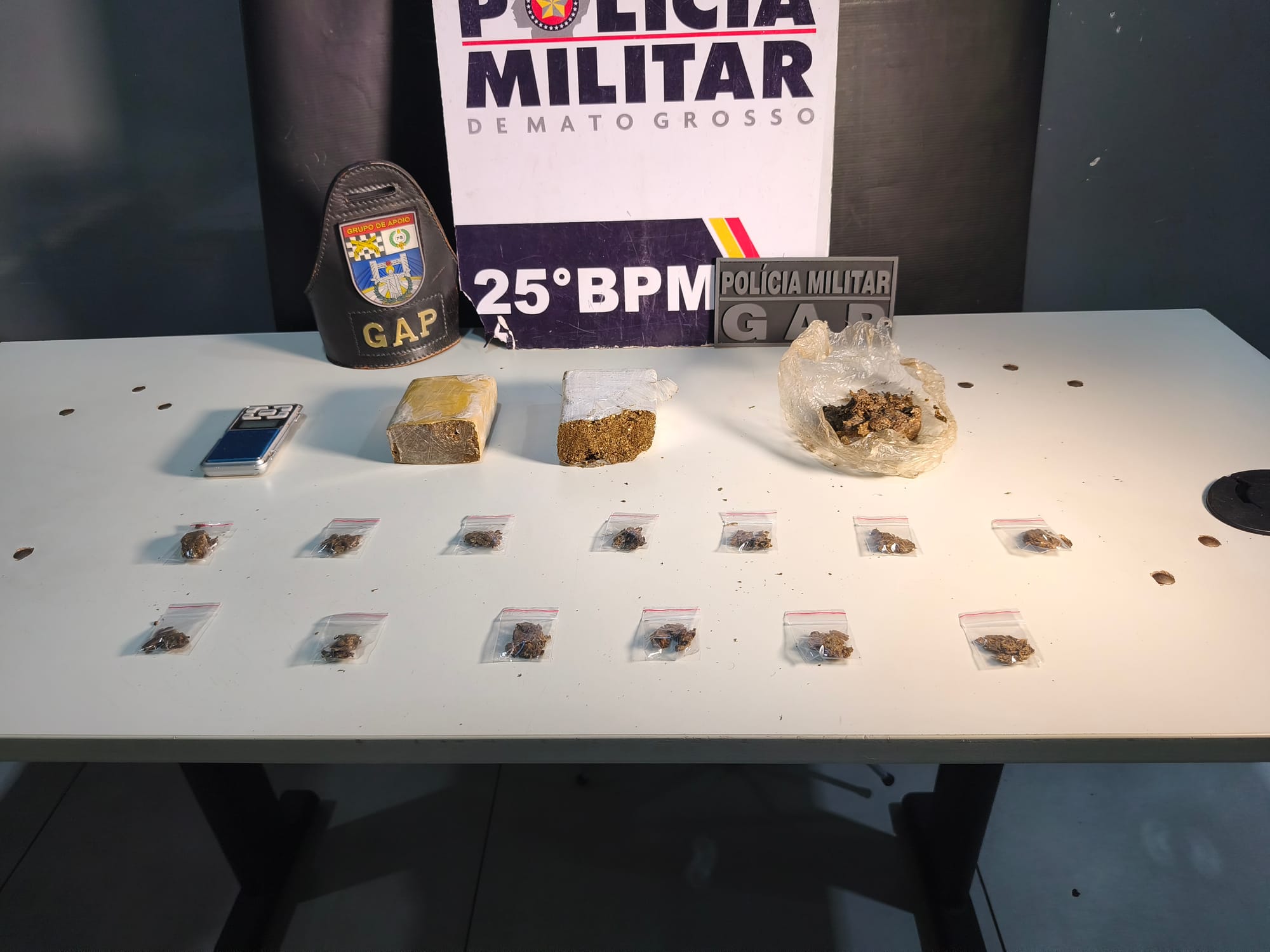 Durante a busca no local, os militares encontraram um carro e uma motocicleta, ambos apreendidos e encaminhados ao 25º Batalhão. Além dos veículos, o GAP localizou porções de substância análoga à maconha e balanças de precisão — materiais comumente utilizados para o preparo e comercialização de drogas.