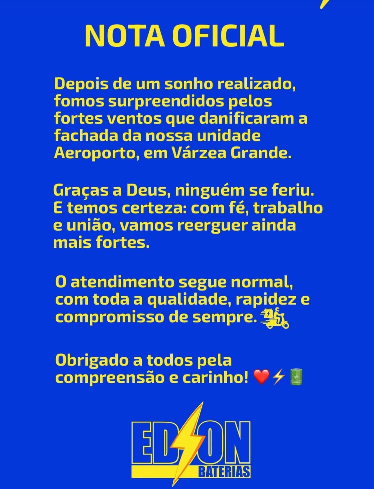 A Edson Baterias divulgou uma nota oficial nesta segunda-feira após ter a fachada de sua unidade localizada no bairro Aeroporto, em Várzea Grande, danificada por fortes ventos que atingiram a região.