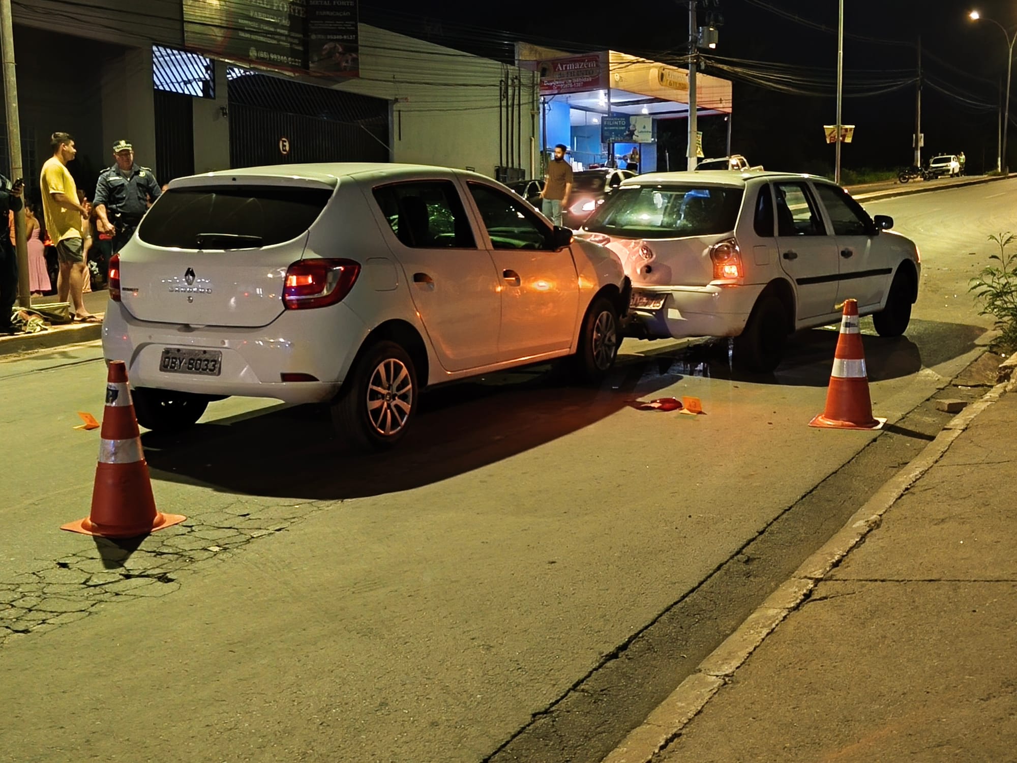 Nas imagens, é possível ver que um veículo Gol reduz a velocidade e chega a parar ao visualizar o acidente à frente. Na sequência, um veículo Sandero surge em alta velocidade e atinge violentamente a motocicleta e a traseira do Gol, arremessando duas pessoas que estavam na moto ao chão.