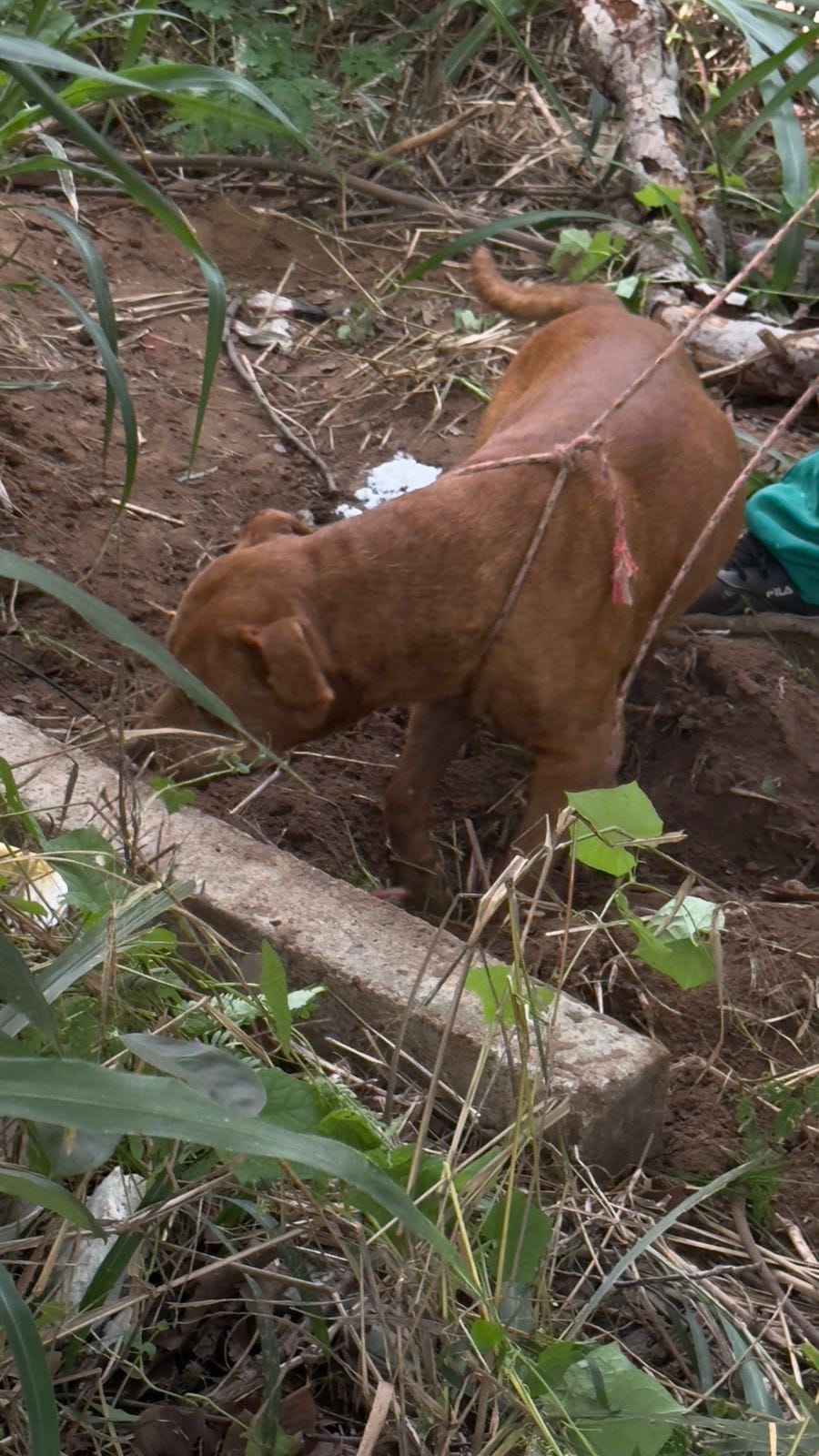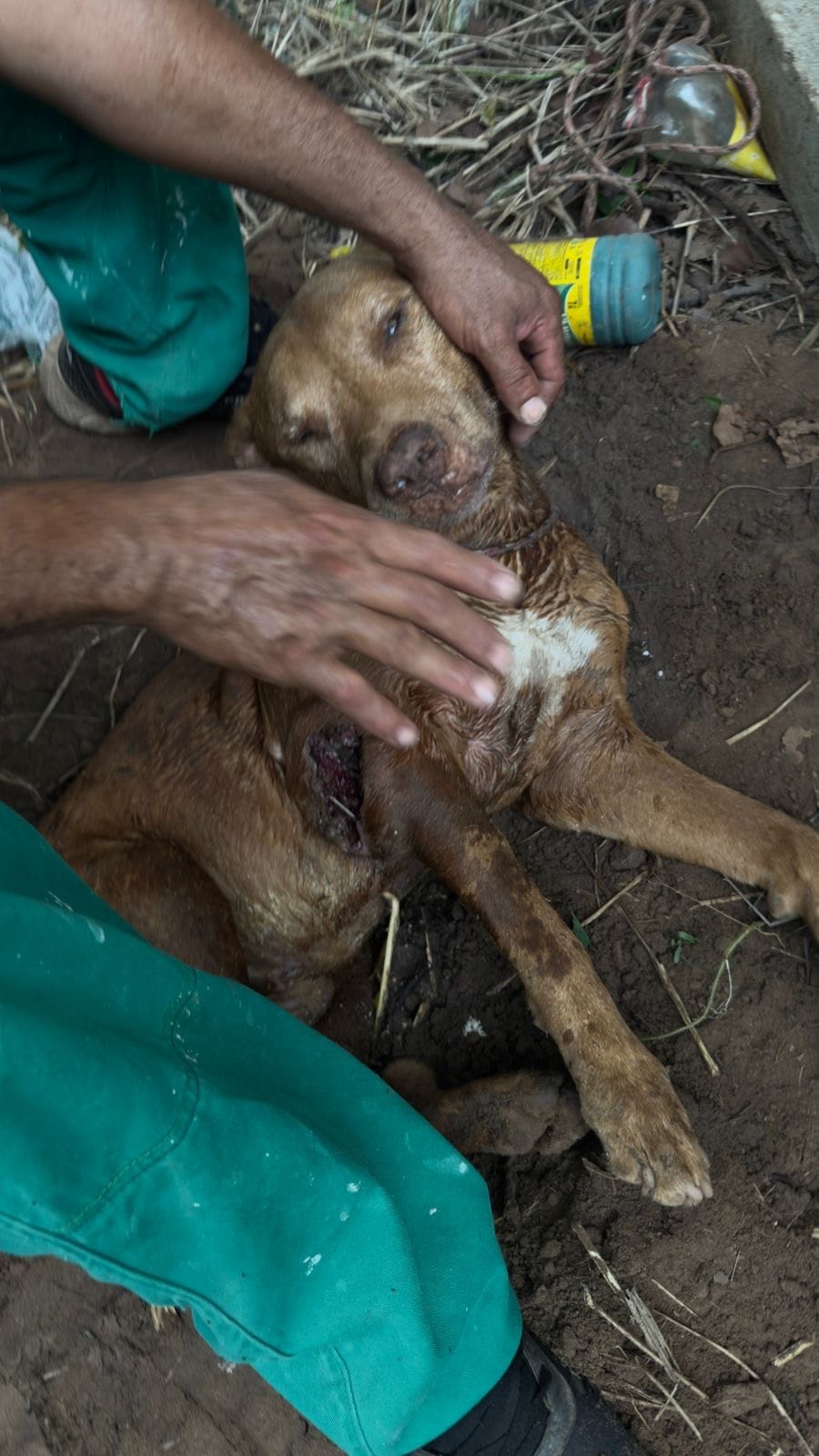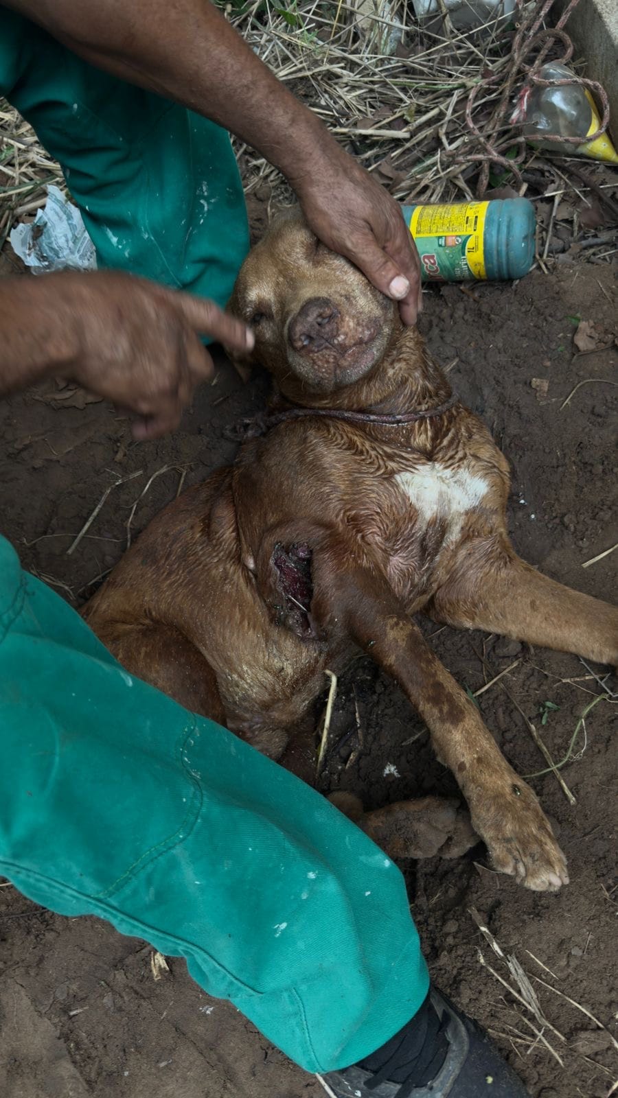 No local, a equipe do 24º Batalhão da Polícia Militar, sob o comando da 2ª tenente PM Kamilla Matias, constatou que se tratava de um cachorro da raça pitbull. O animal estava enterrado ainda com vida, em estado extremamente debilitado, apresentando sinais de quase desfalecimento e uma grave lesão aberta pelo corpo.