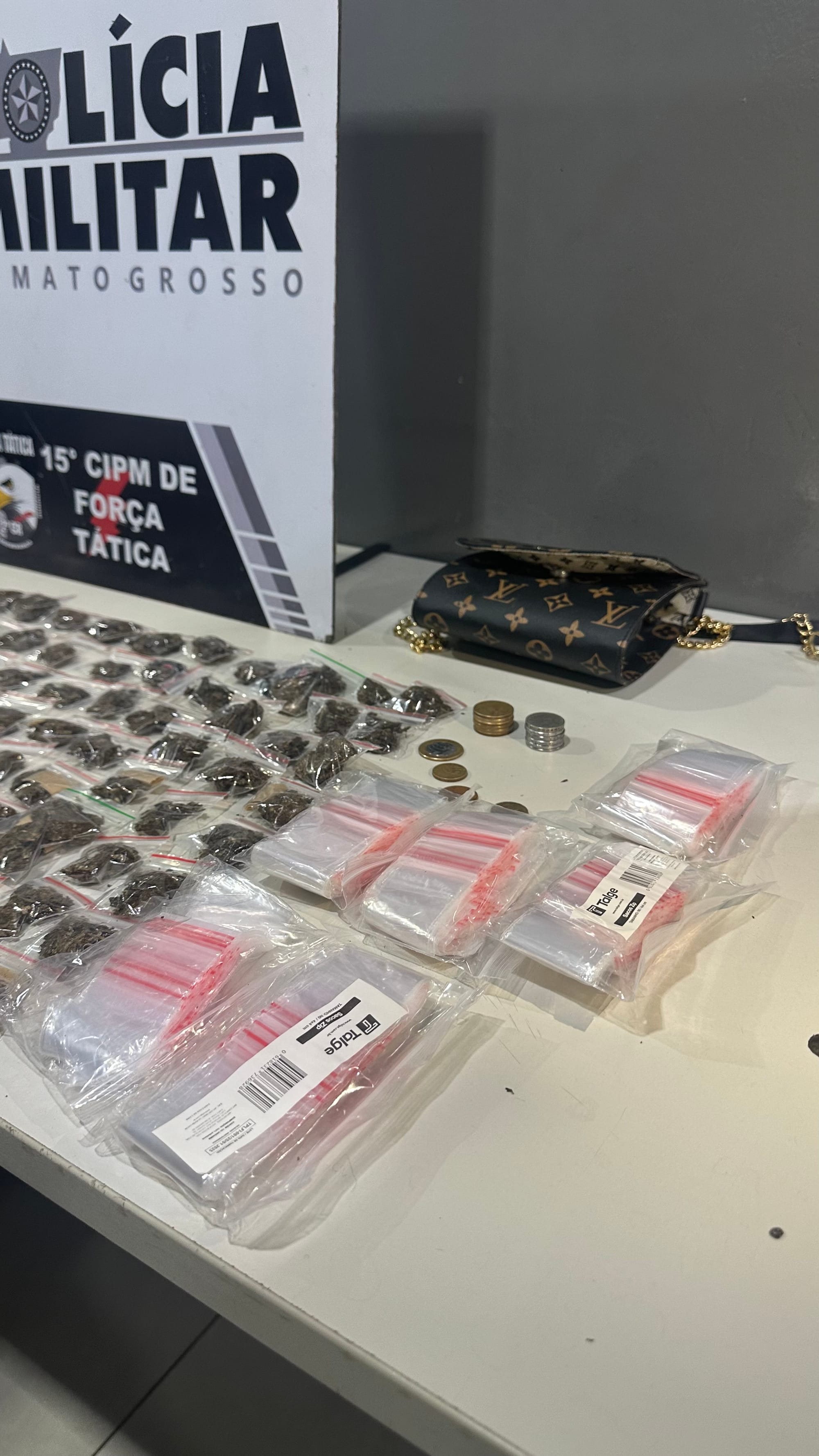 No novo deslocamento, os policiais encontraram o restante do material ilícito, além de dinheiro em espécie e uma balança de precisão, indicando a prática do comércio de drogas.