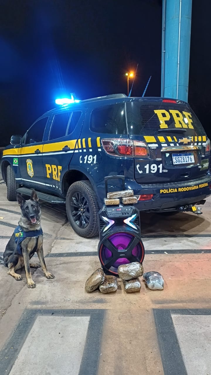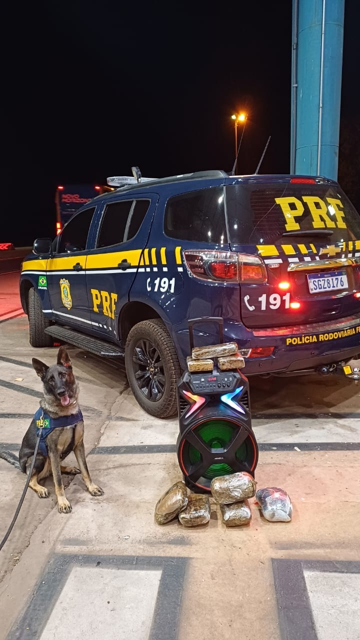 Durante a fiscalização, cão farejador da PRF encontrou cerca de 8 quilos de maconha tipo skunk escondidos dentro de uma caixa de som na bagagem do suspeito.