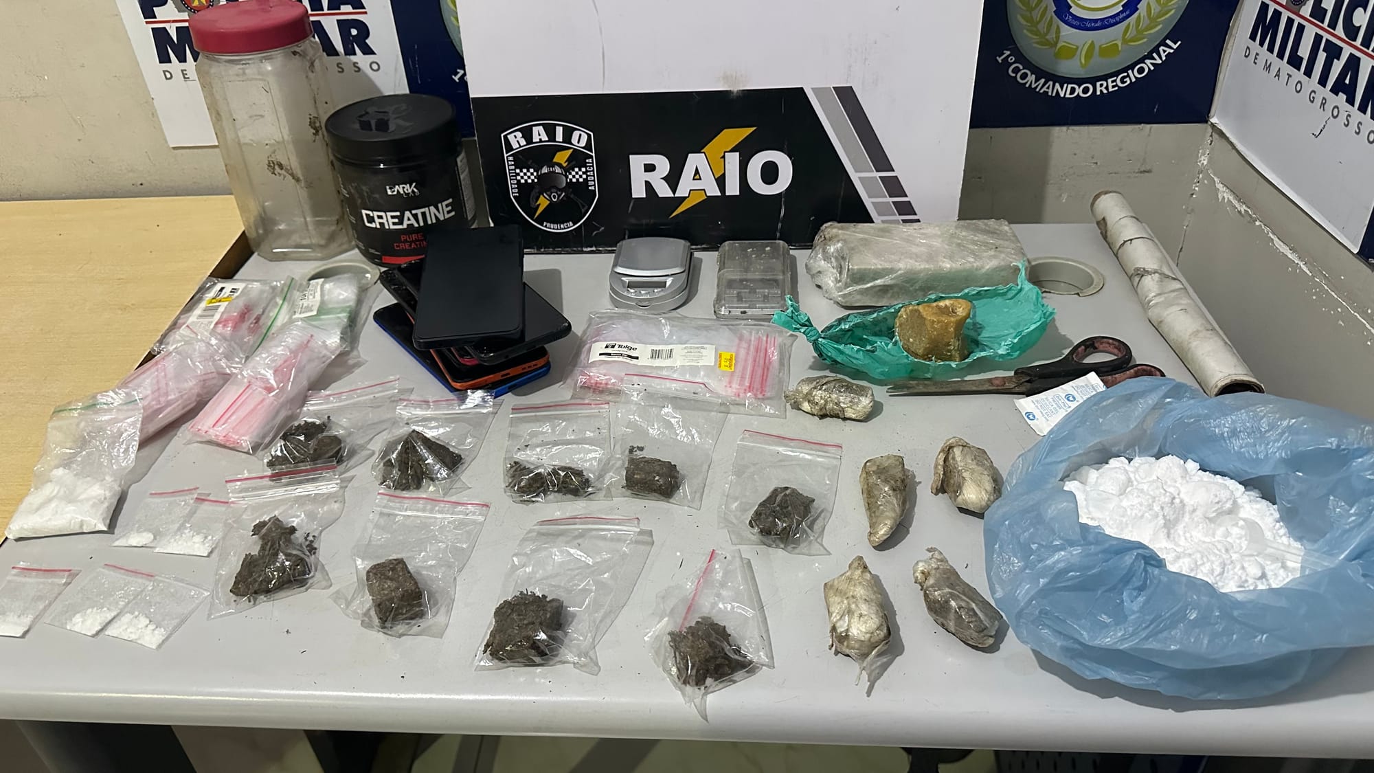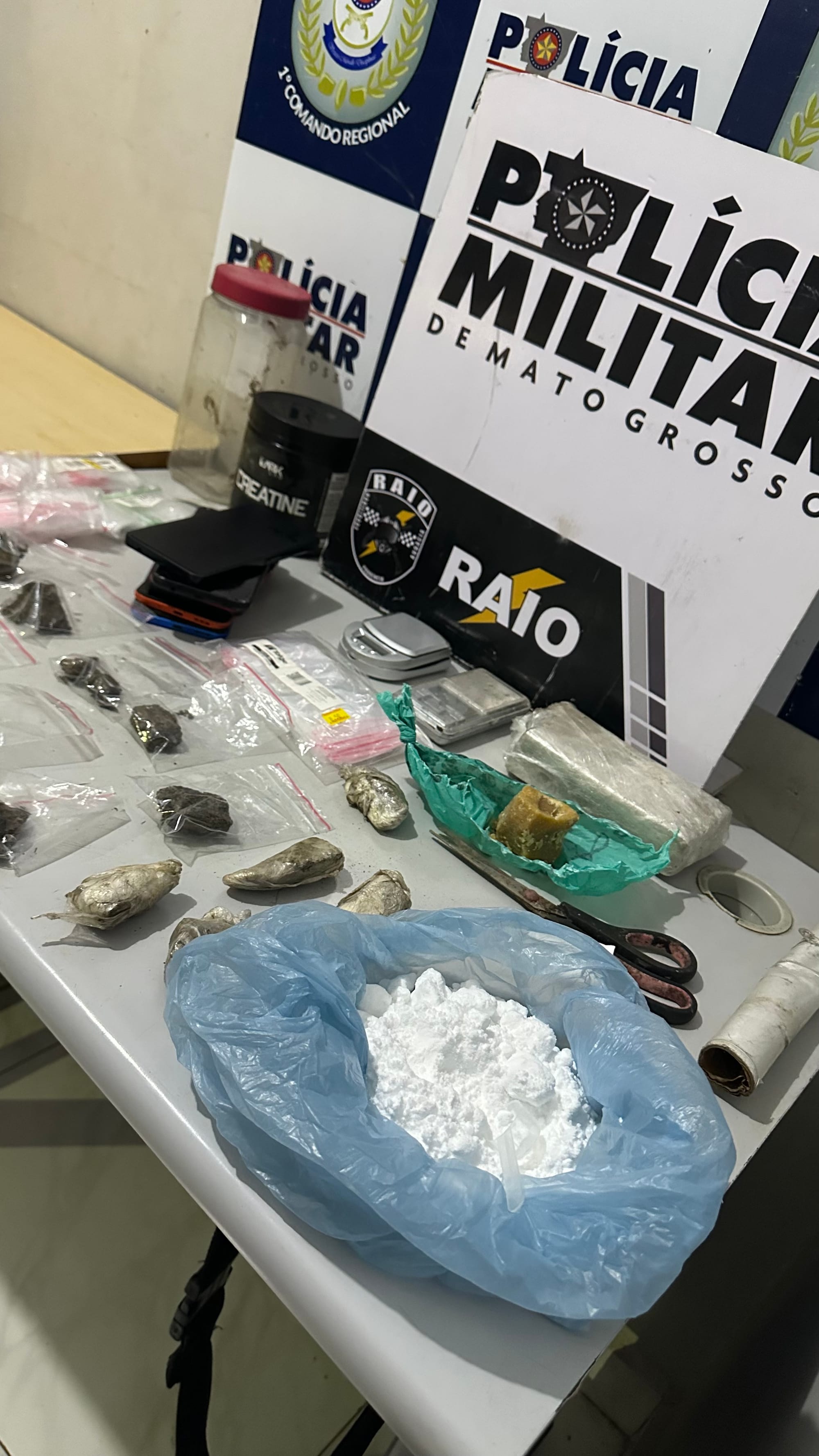 Com o homem, os policiais encontraram entorpecentes. Durante conversa com a equipe, ele confessou que havia escondido mais drogas em outros pontos da área de mata próxima. As equipes retornaram ao local indicado e localizaram pasta base de cocaína, maconha, cocaína, além de diversas embalagens usadas para o preparo e a venda da droga.