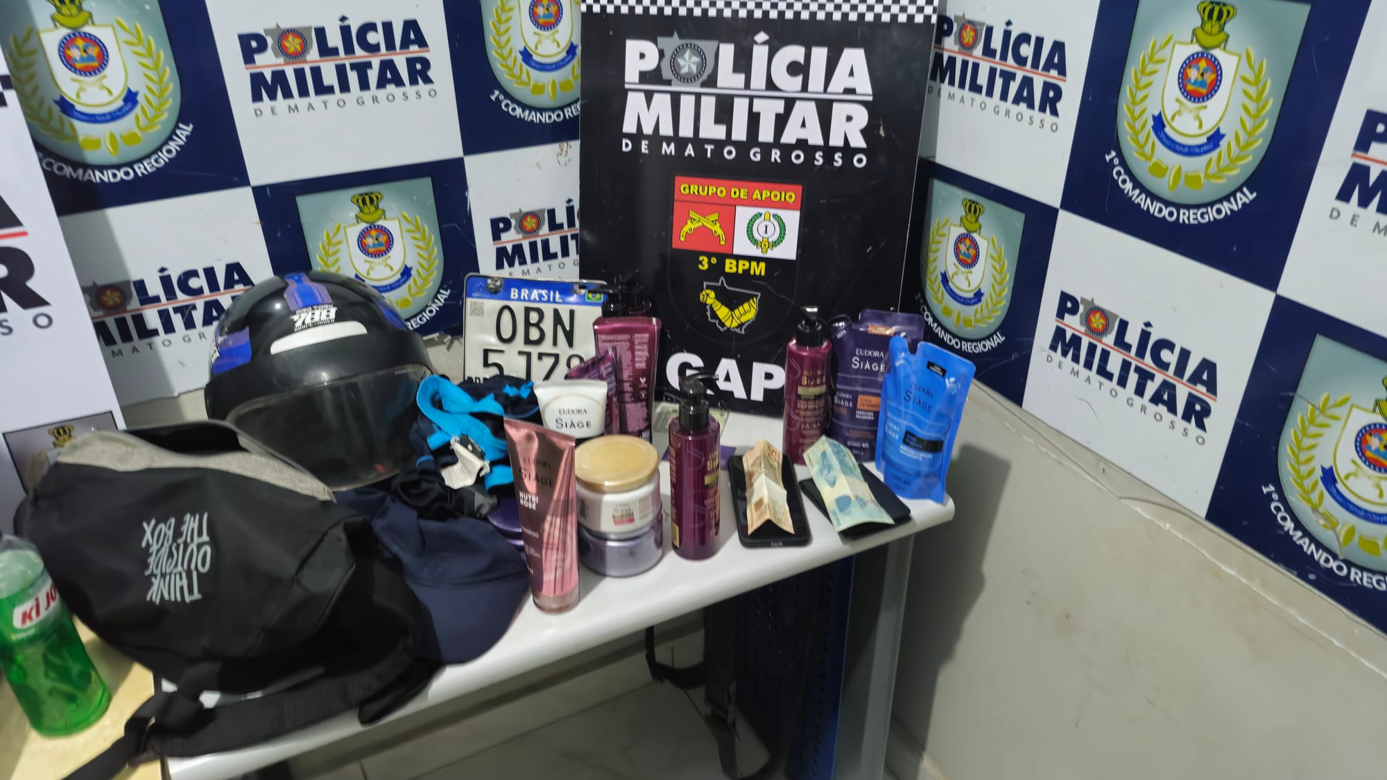 No decorrer da ação, foi localizada uma mochila que havia sido deixada para trás na farmácia durante uma luta corporal com a vítima. Dentro dela, os militares encontraram vestimentas e a placa da motocicleta utilizada no roubo. Após checagem pelo número do chassi, foi confirmado que a placa encontrada correspondia ao veículo conduzido pelo suspeito.