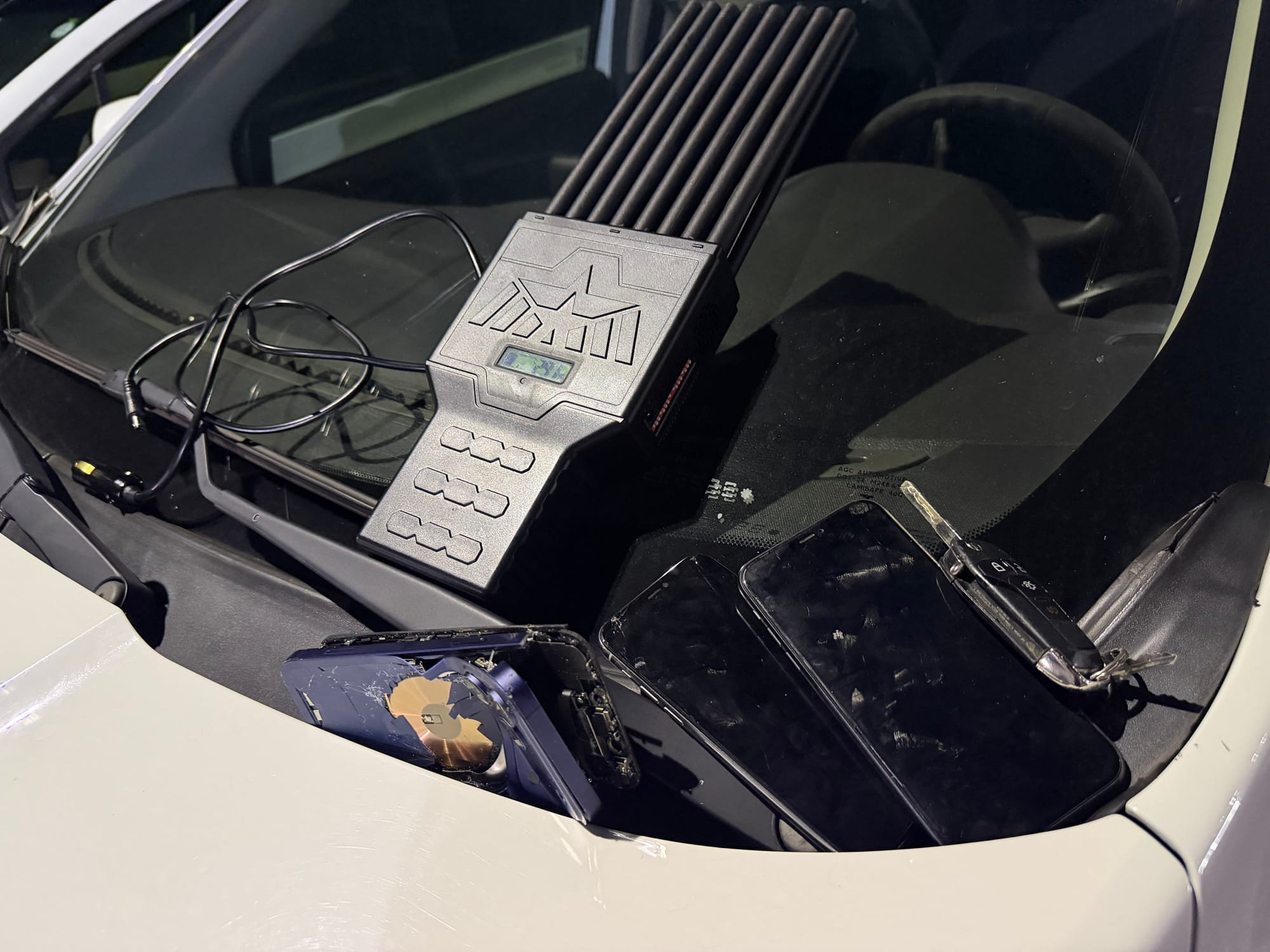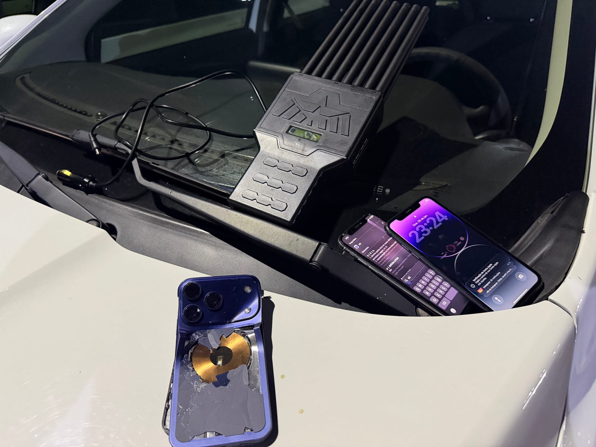 Durante a abordagem, os militares encontraram outros três jovens dentro da residência. No interior do veículo, foi localizado um bloqueador de sinal, equipamento geralmente usado para dificultar o rastreamento do automóvel. Ainda durante a ação, um dos suspeitos quebrou o próprio telefone celular.