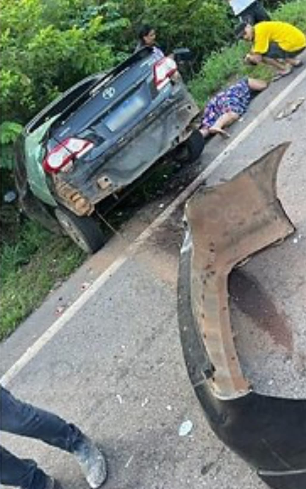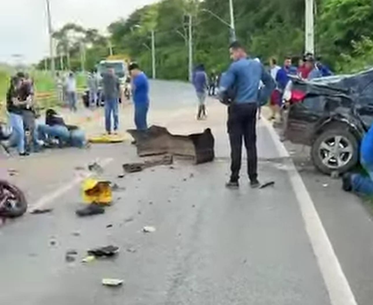 Imagens que circulam nas redes sociais mostram um cenário de destruição, com um dos veículos completamente capotado e uma motocicleta também envolvida na batida. Em meio ao caos, um homem foi visto caído sobre a pista, aguardando atendimento médico.